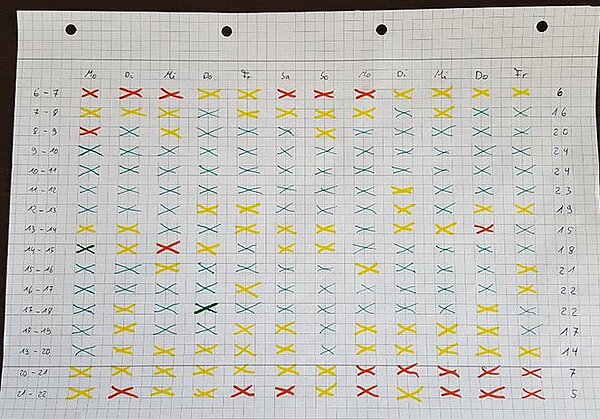 Am einfachsten funktioniert das so: Du legst dir auf einem Zettel eine Tabelle mit den Wochentagen als Spalten und Uhrzeiten als Zeilen an. Nimm am besten einstündige Intervalle, also von 6 bis 7 Uhr, dann von 7 bis 8 Uhr, von 8 bis 9 Uhr und so weiter. Als Anfangs- und Endpunkt verwendest du deine regulären Schlafzeiten.