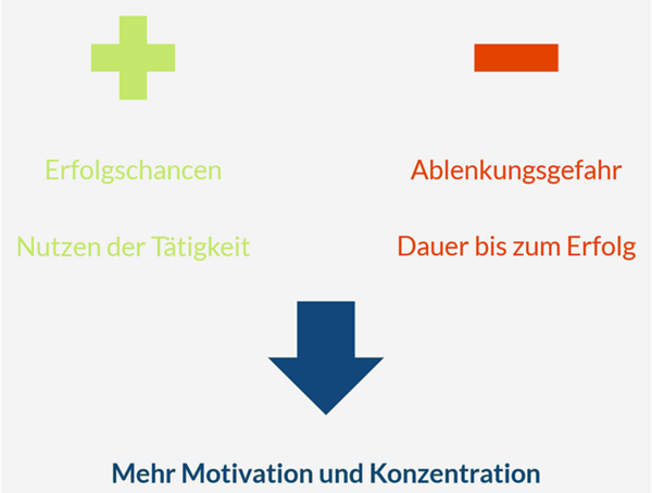 Nicht nur die Erfolgschancen deiner Tätigkeiten sollten möglichst hoch sein, sondern auch der Nutzen, den du daraus ziehst. Sowohl die Arbeit an sich als auch das Ergebnis müssen dich begeistern, um ein Maximum an Motivation zu erzeugen.